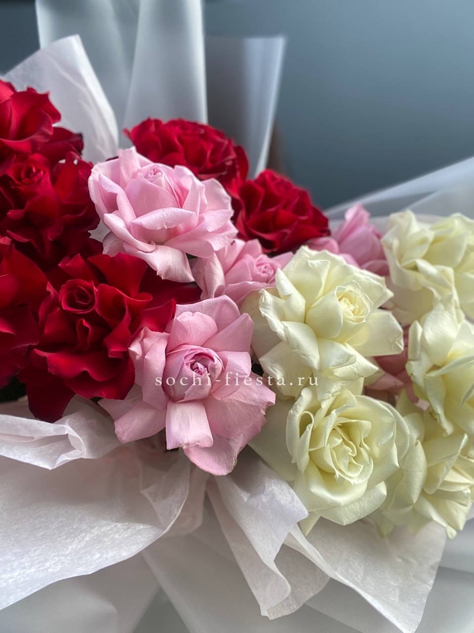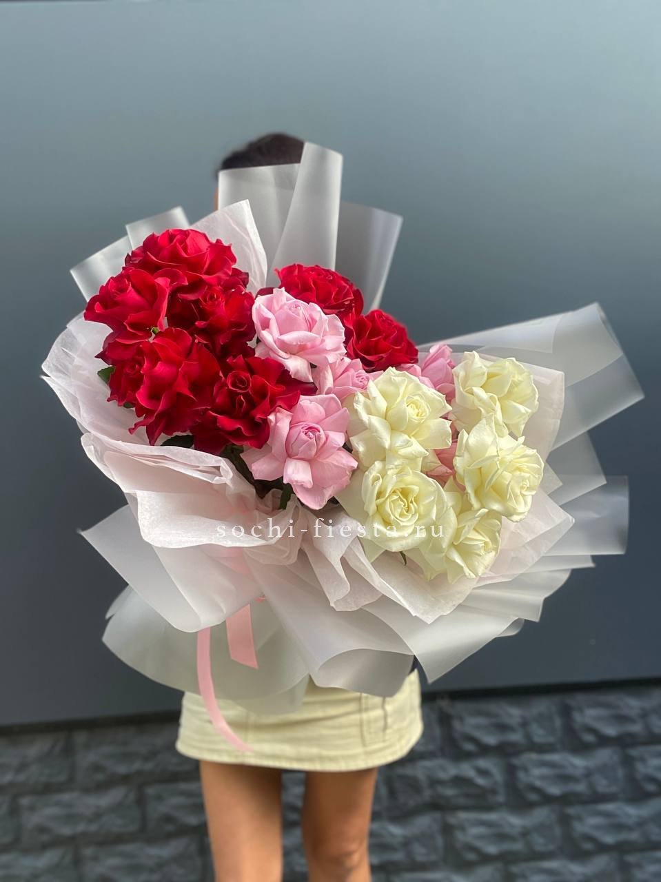 Красный и белый чередуются в свободном ритме, образуя живую композицию. Пятьдесят пять бутонов создают объёмное цветовое полотно, где каждый оттенок усиливает звучание другого.