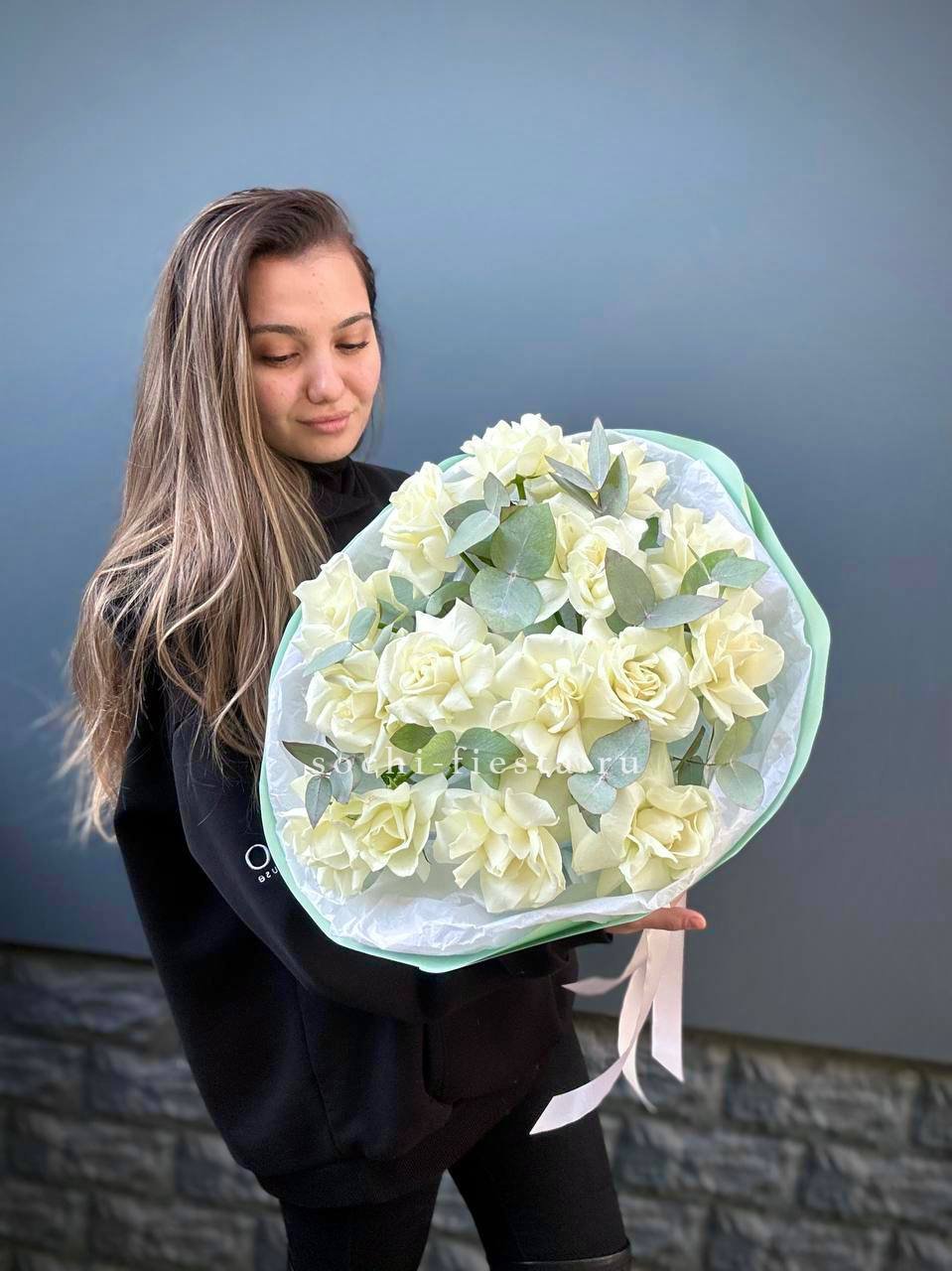вывернутые розы - 15 шт., эвкалипт-1шт., лента, авторская упаковка.