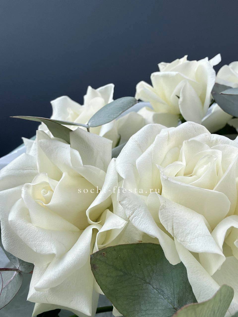 Французские розы Notte Bianca раскрываются широкими вывернутыми бутонами с фактурной глубиной. Эвкалипт добавляет графичности и подчёркивает архитектуру каждого цветка.