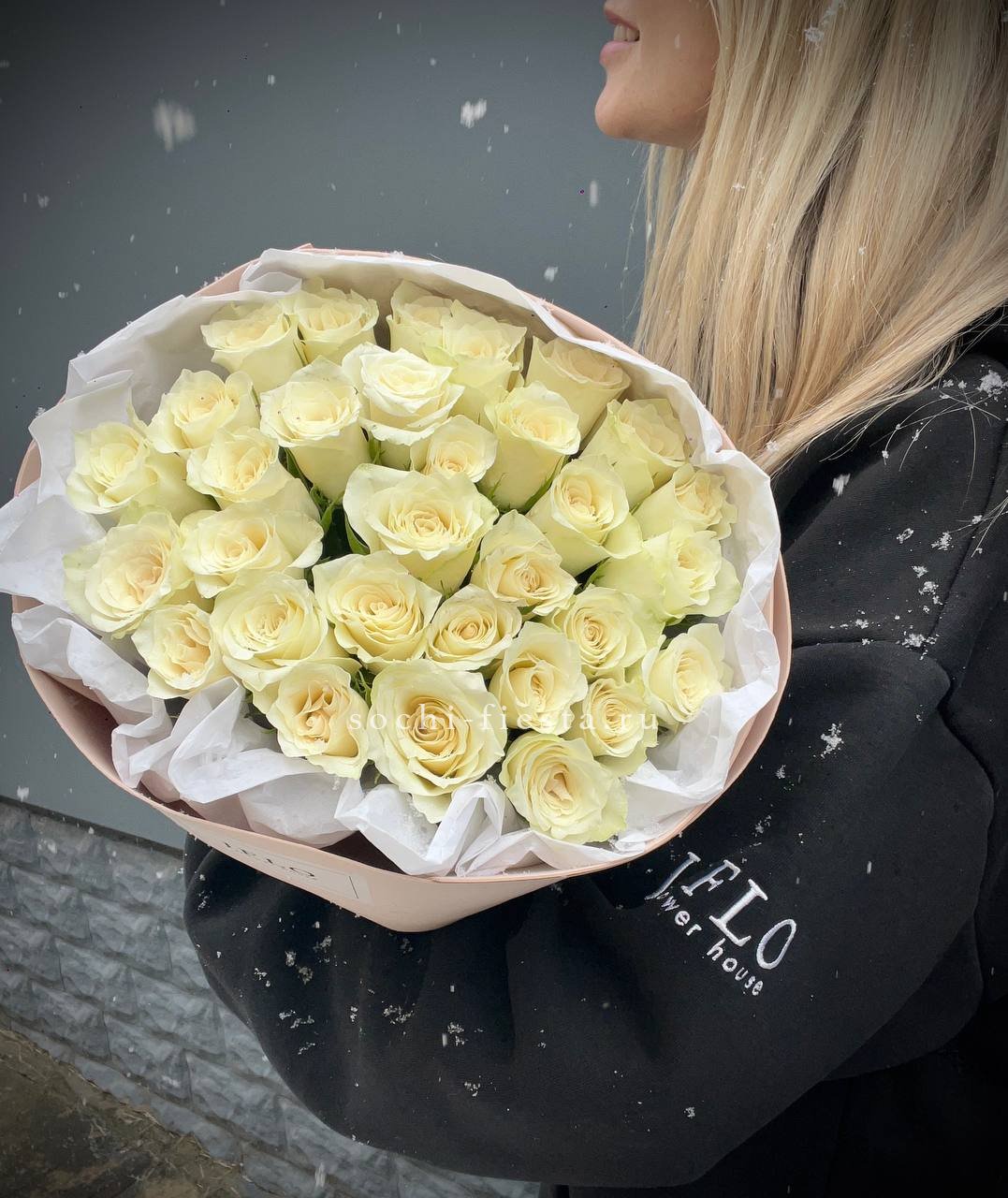 Тридцать один белый бутон формирует внушительную композицию, которая привлекает внимание своим присутствием. Букет выглядит цельно и заполняет собой любое пространство.