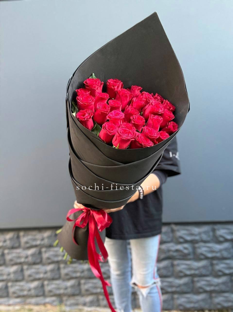 25 красных голландских роз, лента, упаковка на выбор.