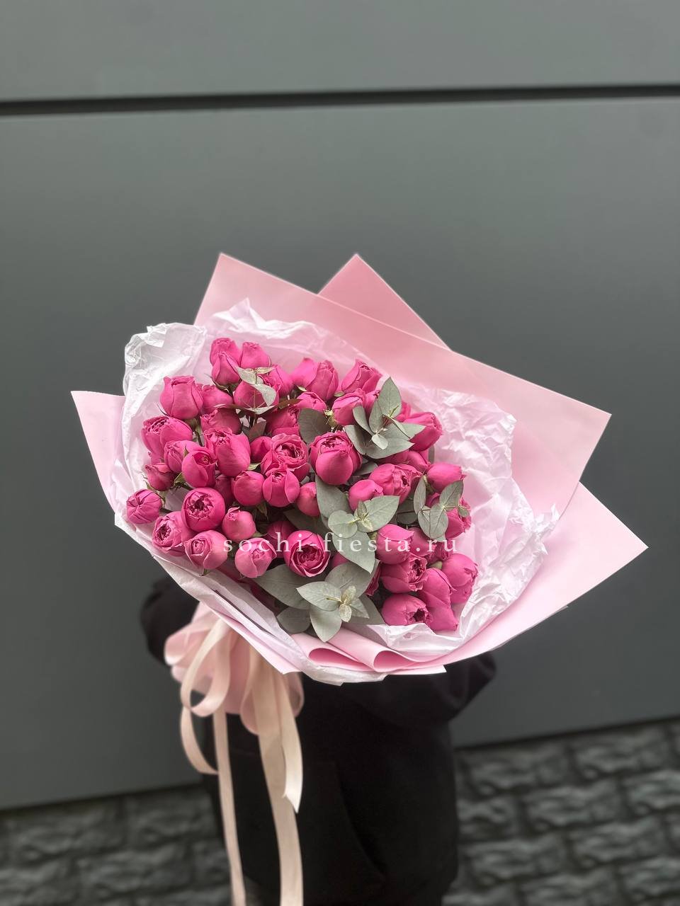 Сто один стебель кустовой розы собраны в плотный букет с множеством мелких бутонов. Каждая ветвь раскрывается пышной шапкой соцветий, создавая объёмную текстуру и живую динамику композиции.