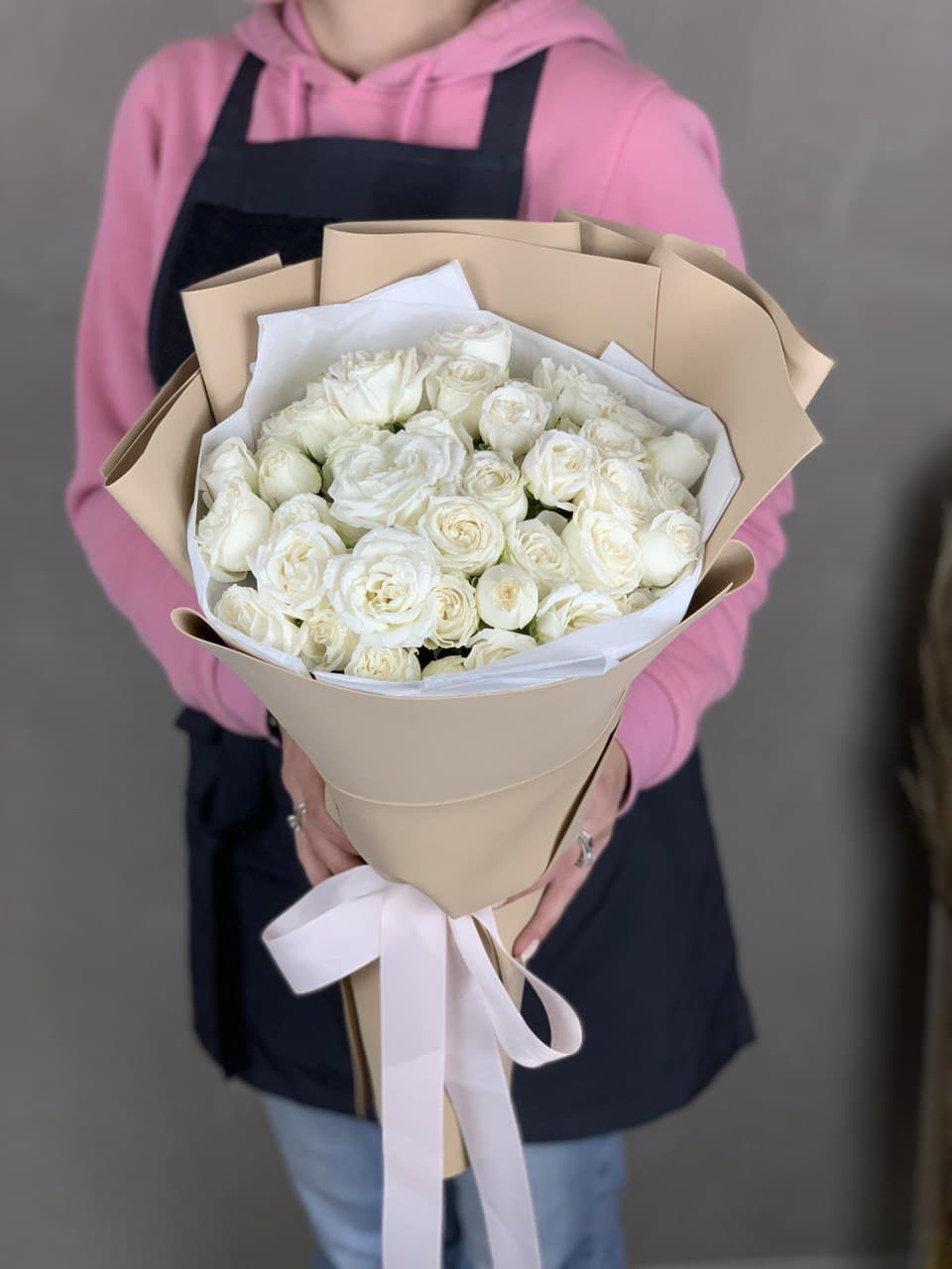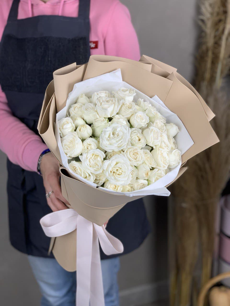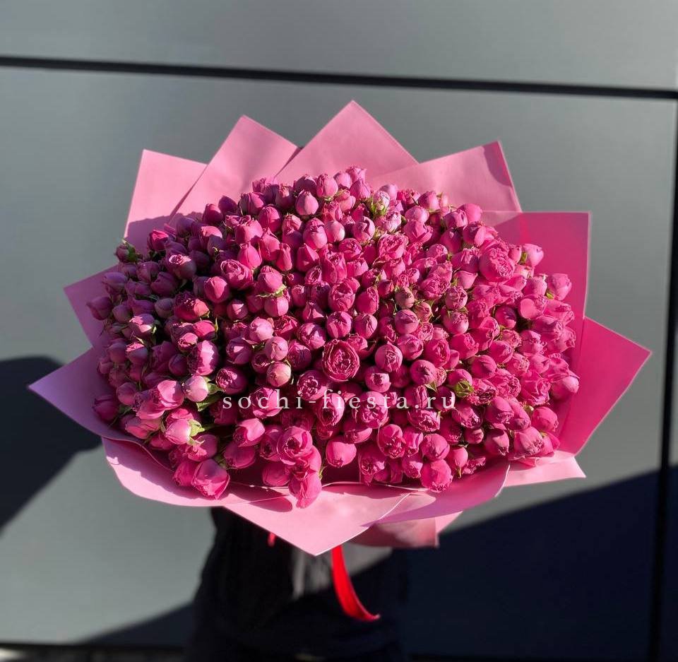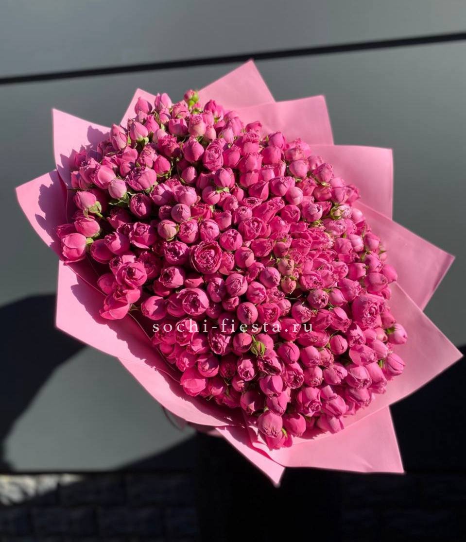 55 роз сорта Misty bubbles и bombastic, лента, дизайнерская упаковка.
