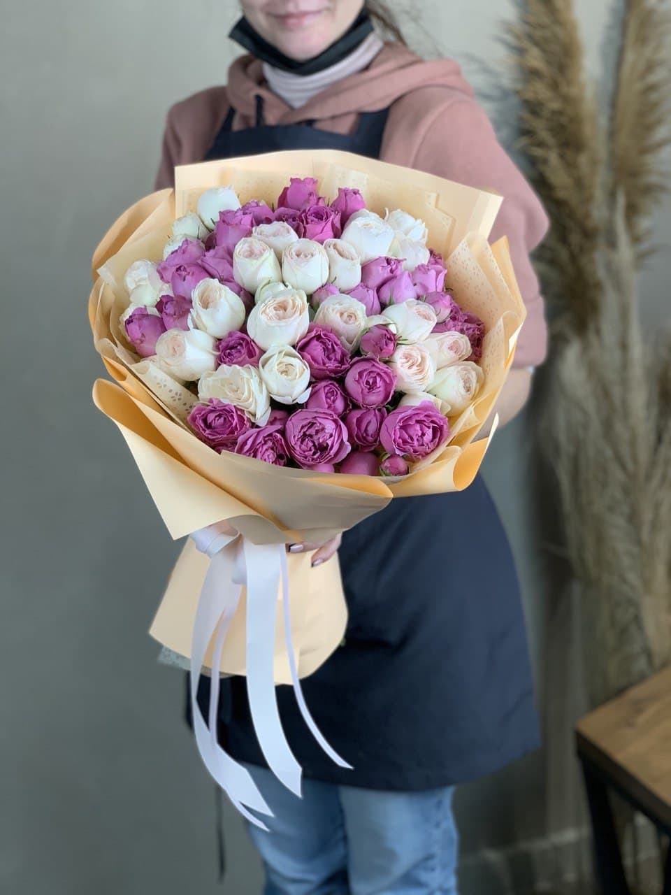 Пятнадцать пионовидных роз дополнены воздушным ковылём в минималистичном оформлении. Текстура густомахровых бутонов раскрывается слоями кремово-розовых лепестков с бежевым отливом.