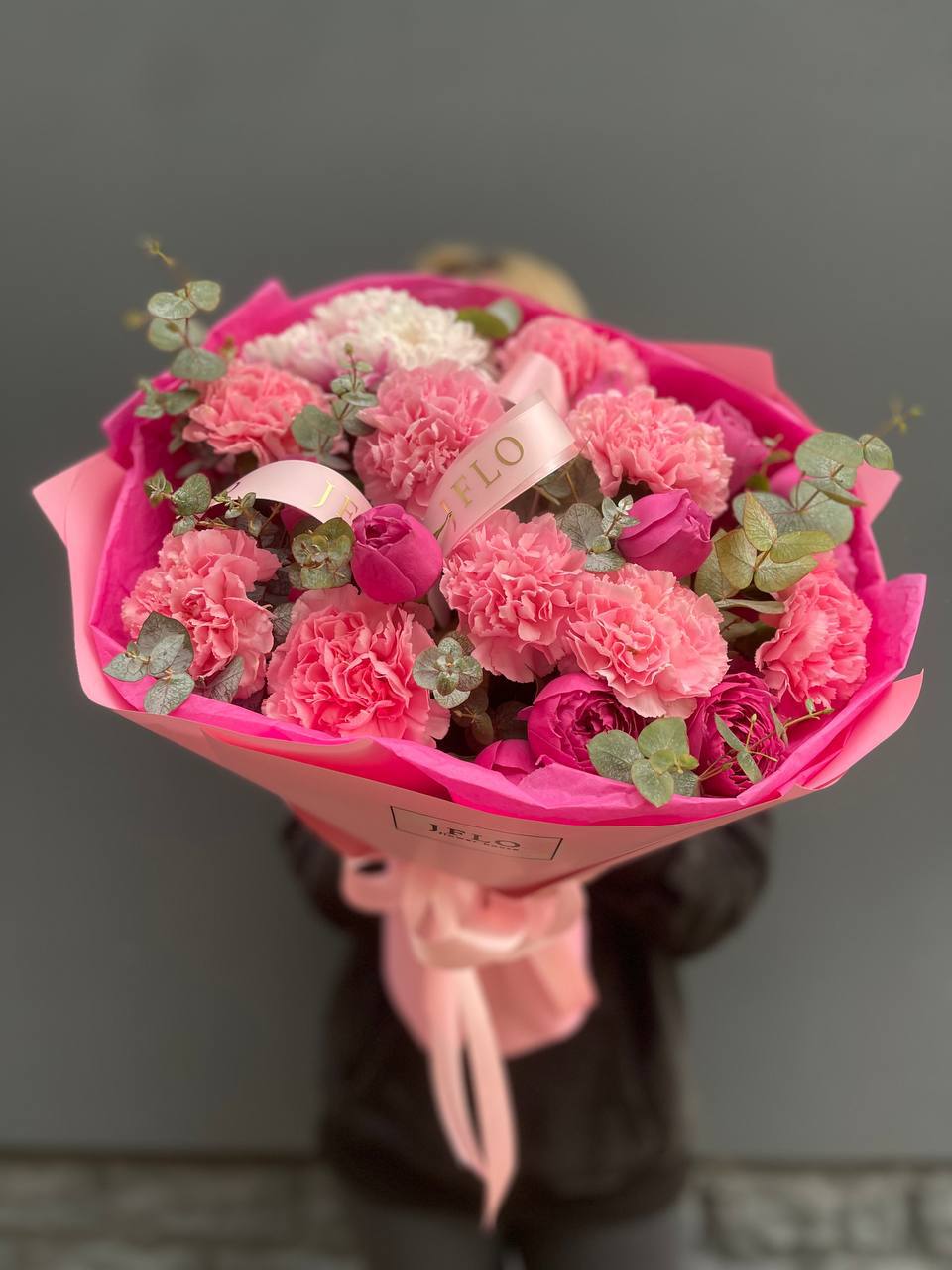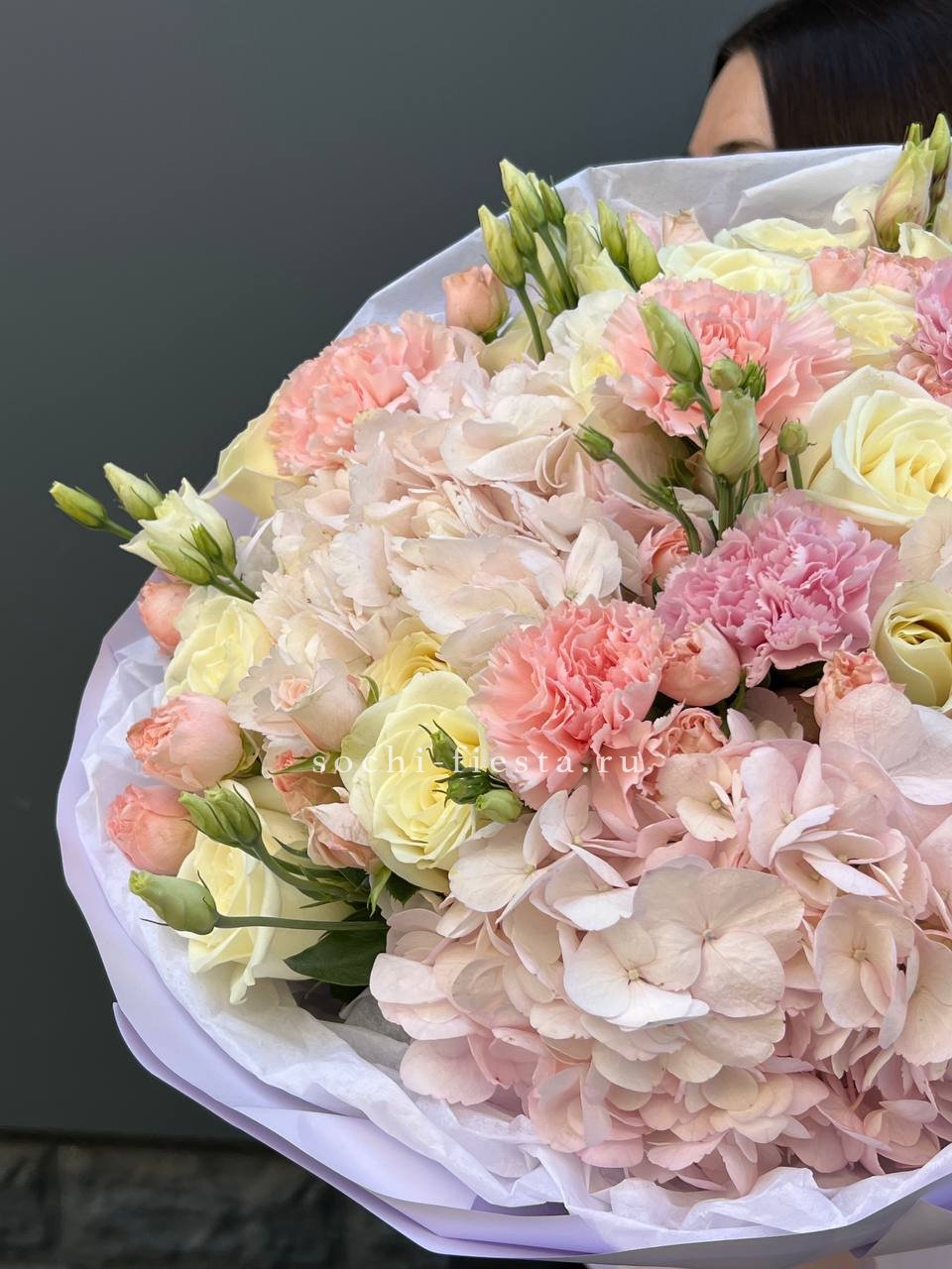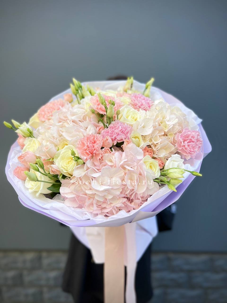 гортензия, герберы, эустомы, розы, диантус, эвкалипт, лента, дизайнерская упаковка.