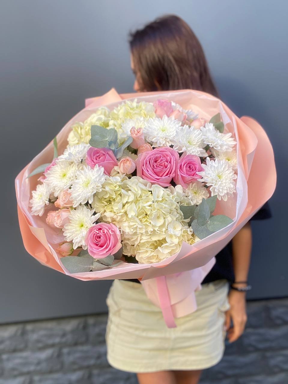 Герберы задают открытый характер букета, розы добавляют мягкости, а гортензия наполняет объёмом. Композиция смотрится свежо и держит форму без усилий.
