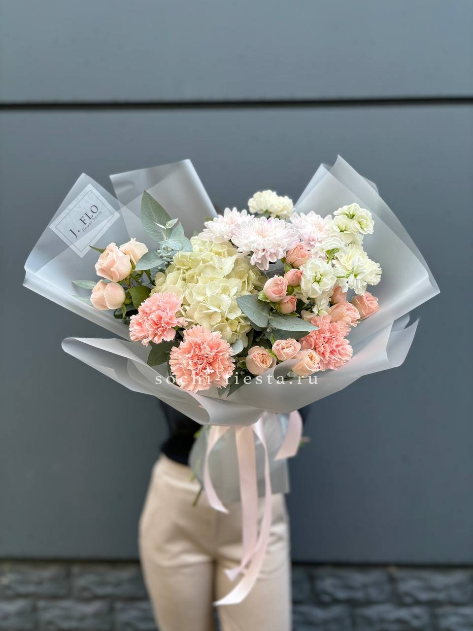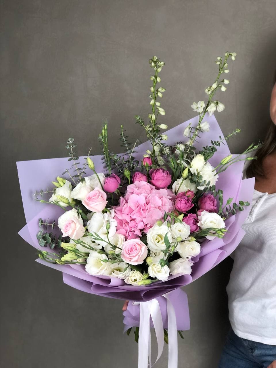 Белые розы и шары гортензии заполняют пространство плотно, но без тяжести. Озатамус вносит лёгкую текстуру, а эвкалипт завершает силуэт спокойной зеленью.