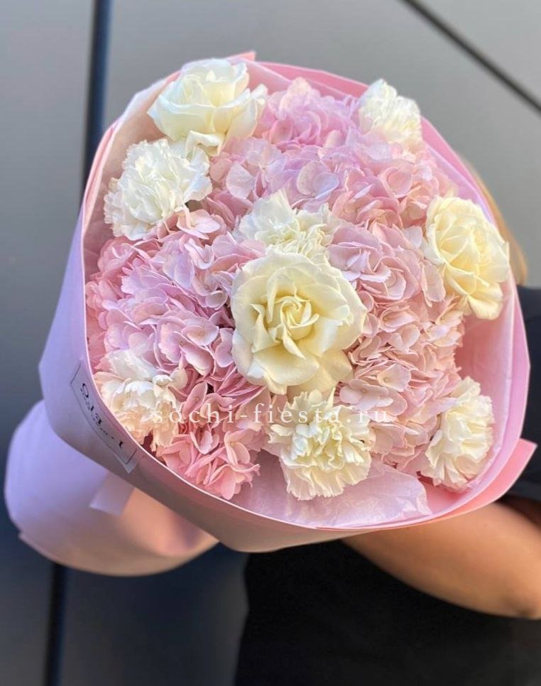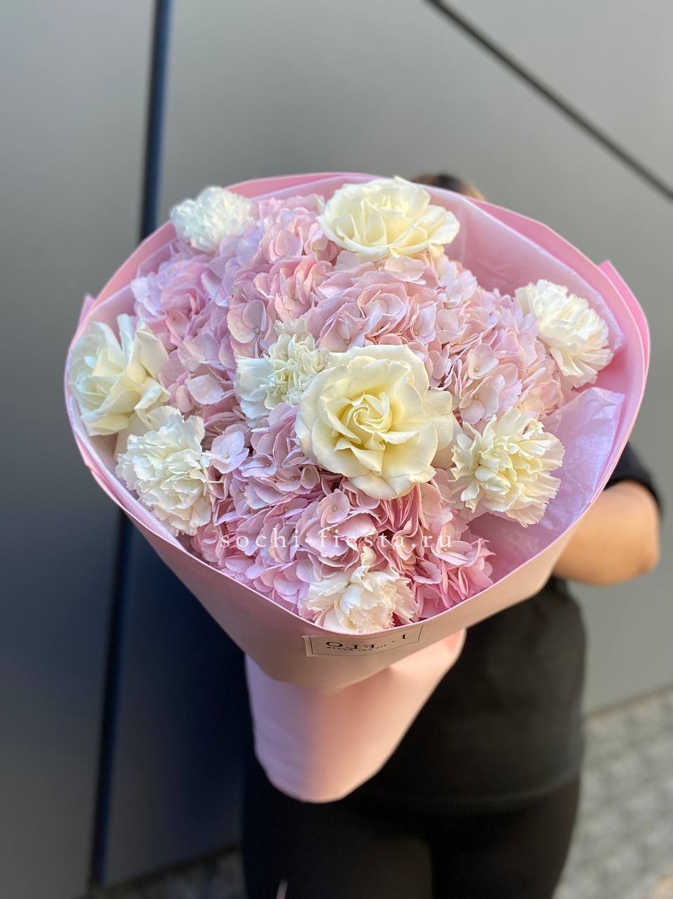 Пышные шапки гортензии создают воздушный объём, а белые розы добавляют графичности. Букет держит форму и легко размещается в любом пространстве.