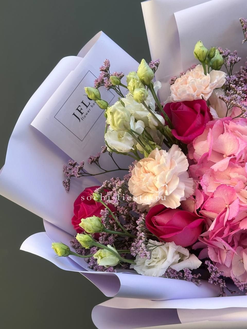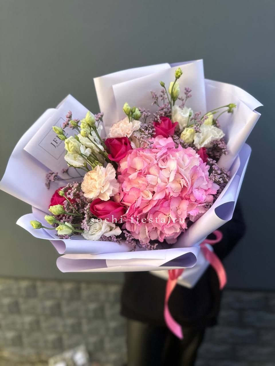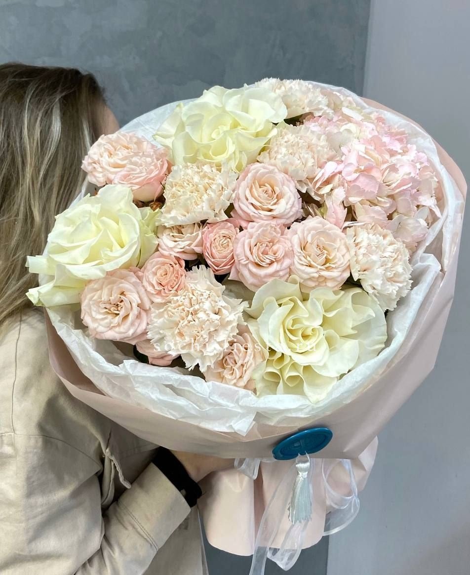 Пышные шапки гортензии задают объём, а россыпь кустовых роз создаёт живую текстуру по всей форме. Композиция наполнена воздухом и естественной лёгкостью.