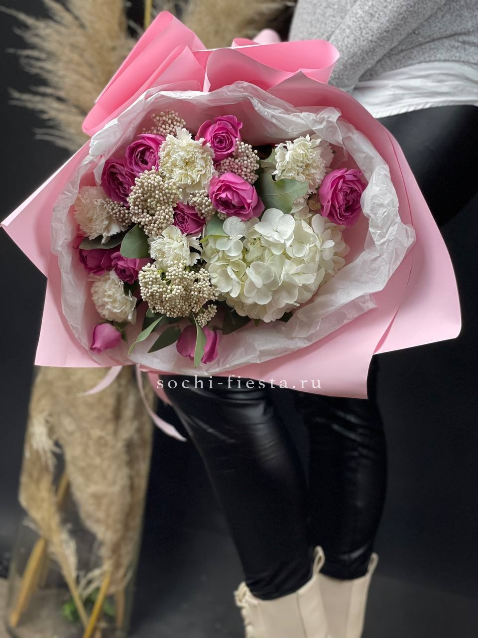 розовая роза, диантус, бомбастик, маттиола в нежном оформлении.