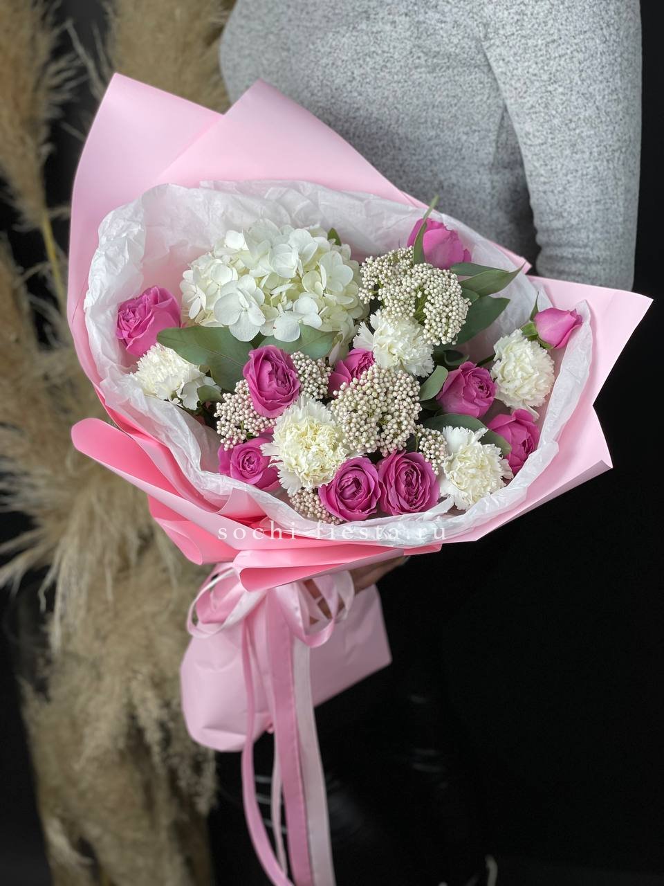 Розовые розы и диантусы окружены пышными соцветиями маттиолы и бомбастика. Композиция собрана плотно, каждый цветок поддерживает соседний, создавая объемную округлую форму. Букет держит силуэт и выглядит цельно с любого ракурса.