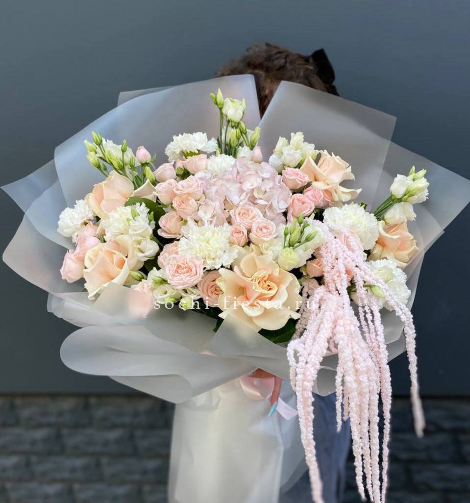 кустовые розы, гортензии, французские розы, диантусы, эустомы, лента и дизайнерская пленка.