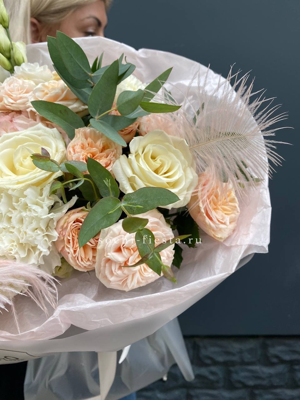 эвкалипт, гортензия, перо, кустовая роза, эустома, роза белая, диантус, упаковка.