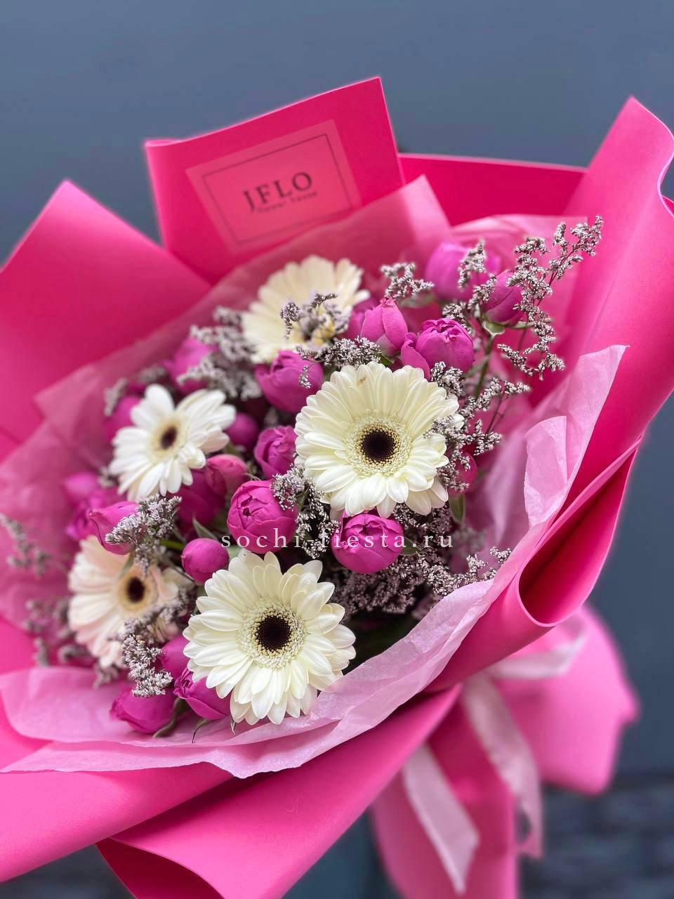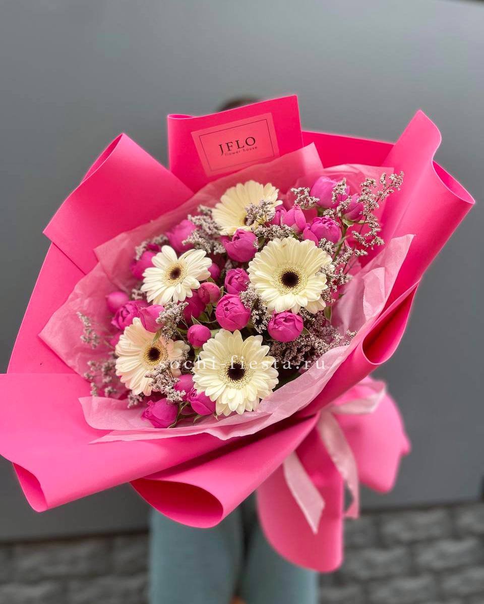 хризантемы кустовые, пионовидные розы, одноголовые розы, лента, дизайнерская упаковка.