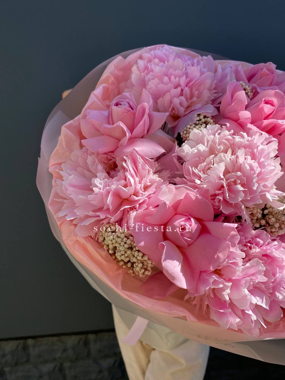 Плотные бутоны пионов собраны с розами в объёмную форму с мягким силуэтом. Озотамус добавляет воздушную текстуру по краям. Композиция в розовой гамме держит форму и выглядит цельно.