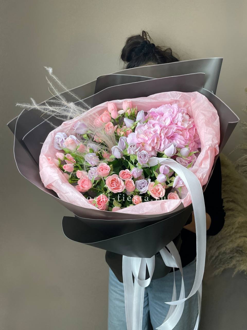 кустовые розы, хризантемы, диантусы, лагурус, лента и дизайнерская пленка.
