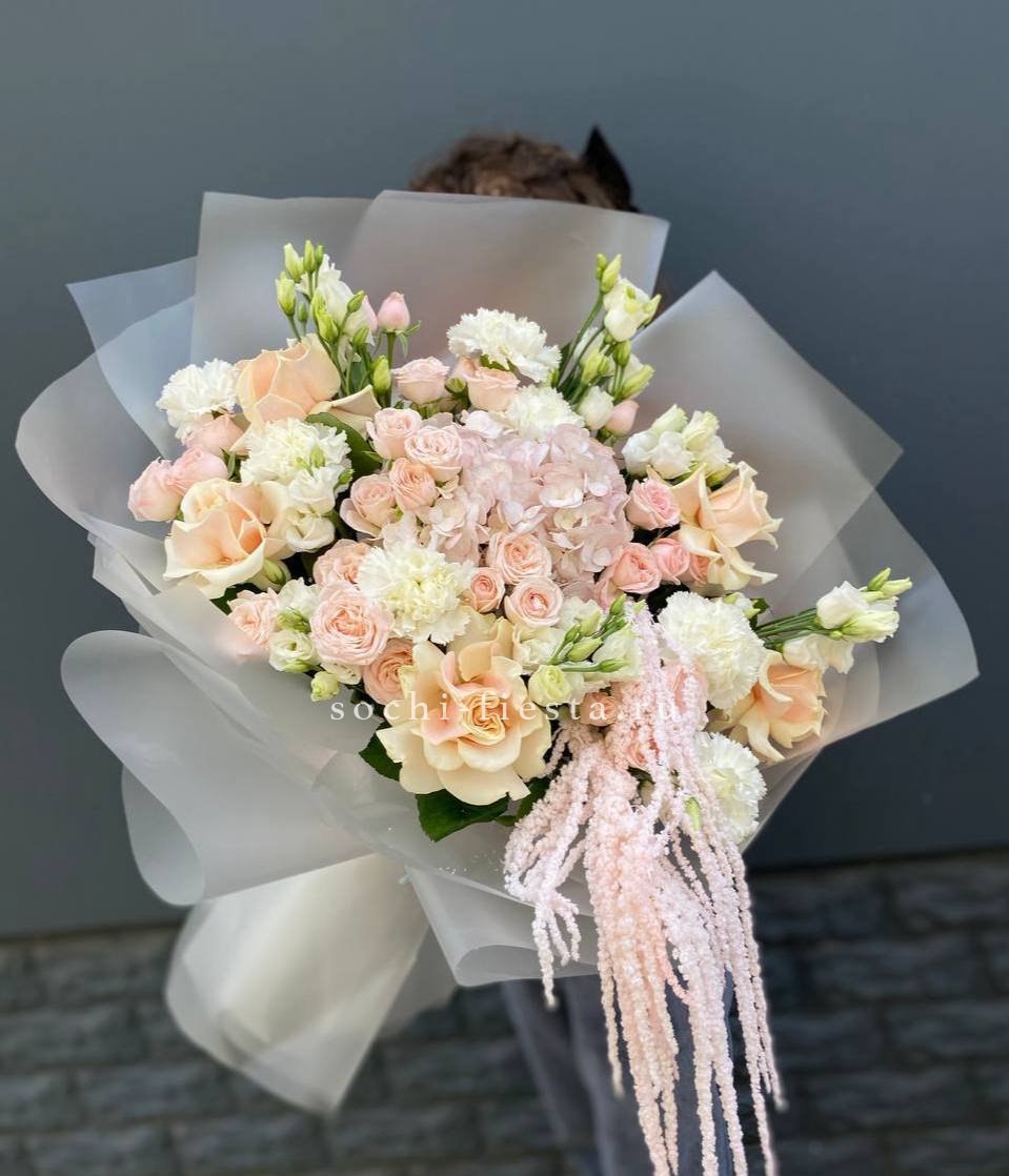 Пастельная гамма с мягкими переходами от кремового к пудровому создаёт спокойное цветовое звучание. Кустовые розы и хризантемы дополнены воздушным лагурусом, который добавляет композиции лёгкости.