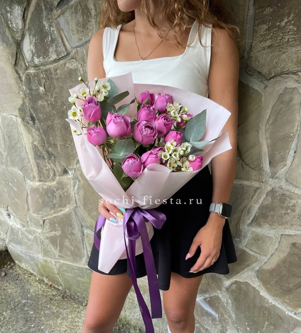 маттиола, диантусы, пионовидные розы Мисти Баблс, эвкалипт, лимониум, эустома лента, упаковка.