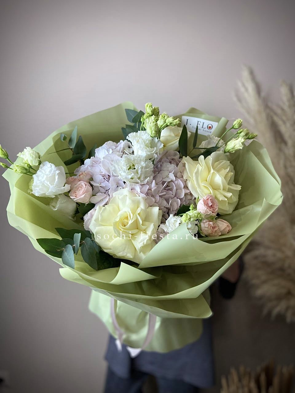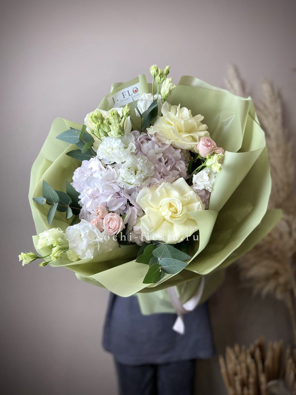 гортензия, кустовая роза, розовая роза, дельфиниум/маттиола/львиный зев, амарантус, эвкалипт или аналог, декор, корейская пленка, лента.