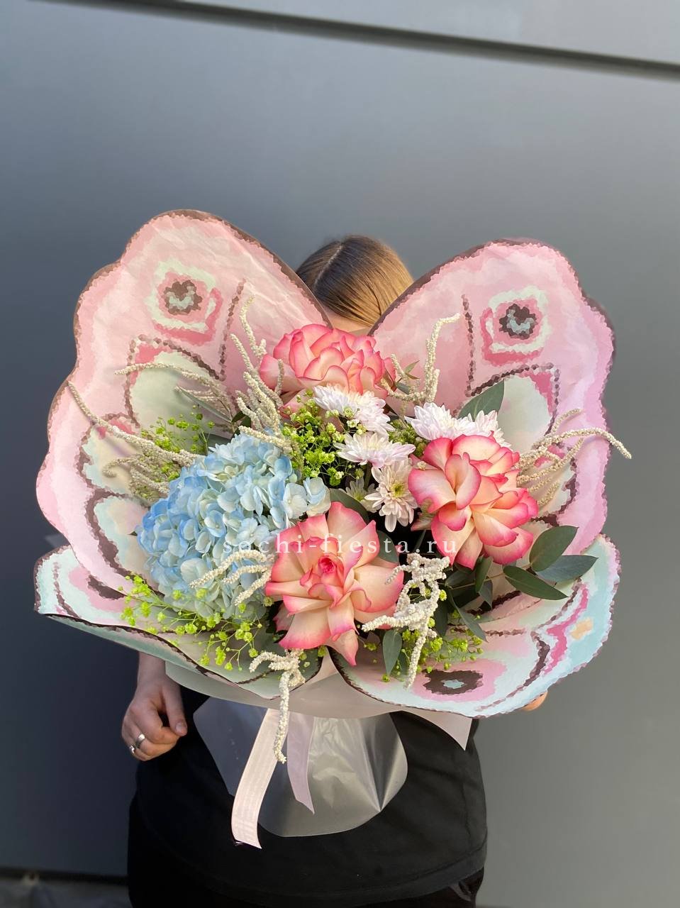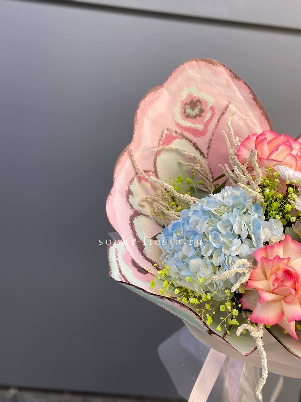 гортензия, диантус, кустовая пионовидная роза, эустома, вспомогательные цветы, эвкалипт, лента, дизайнерская упаковка.