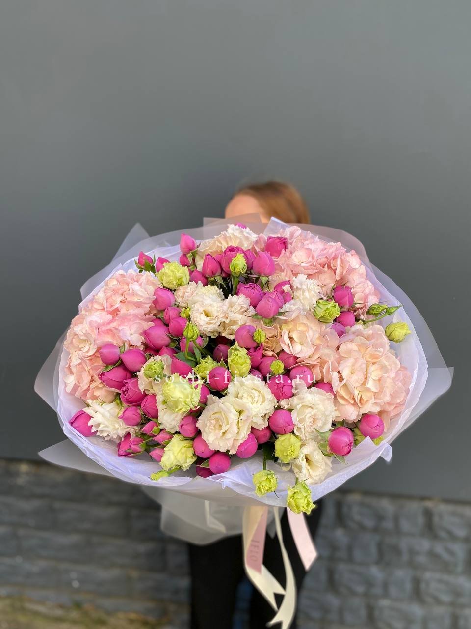 Этот пышный авторский букет напоминает нежное зефирное облако, в котором гармонично сочетаются объемные формы и изысканные оттенки. Композиция представляет собой микс из крупных соцветий гортензии и кустовых роз в пастельной гамме.
