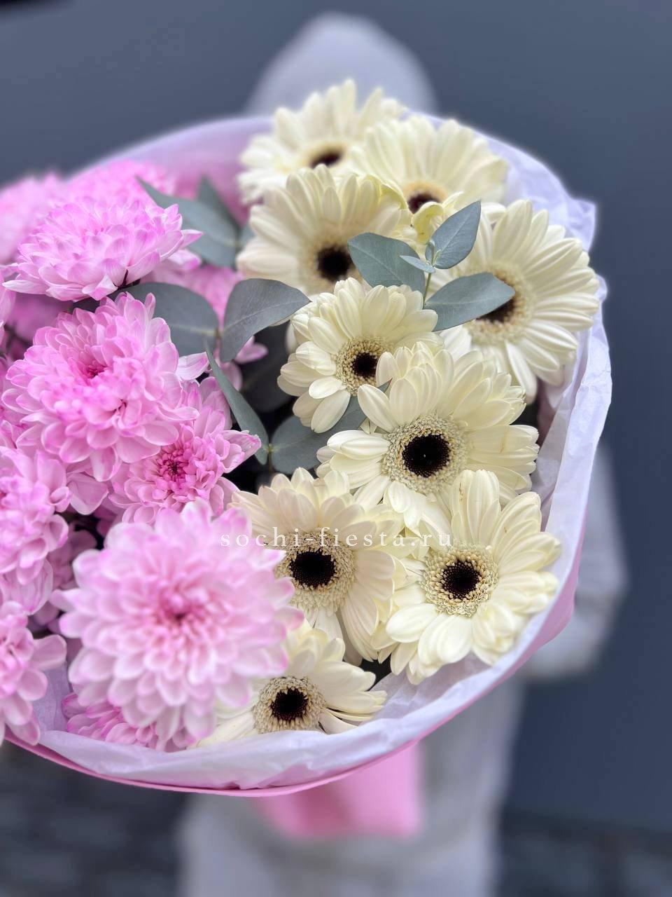 гербера, хризантема, эвкалипт, упаковка.