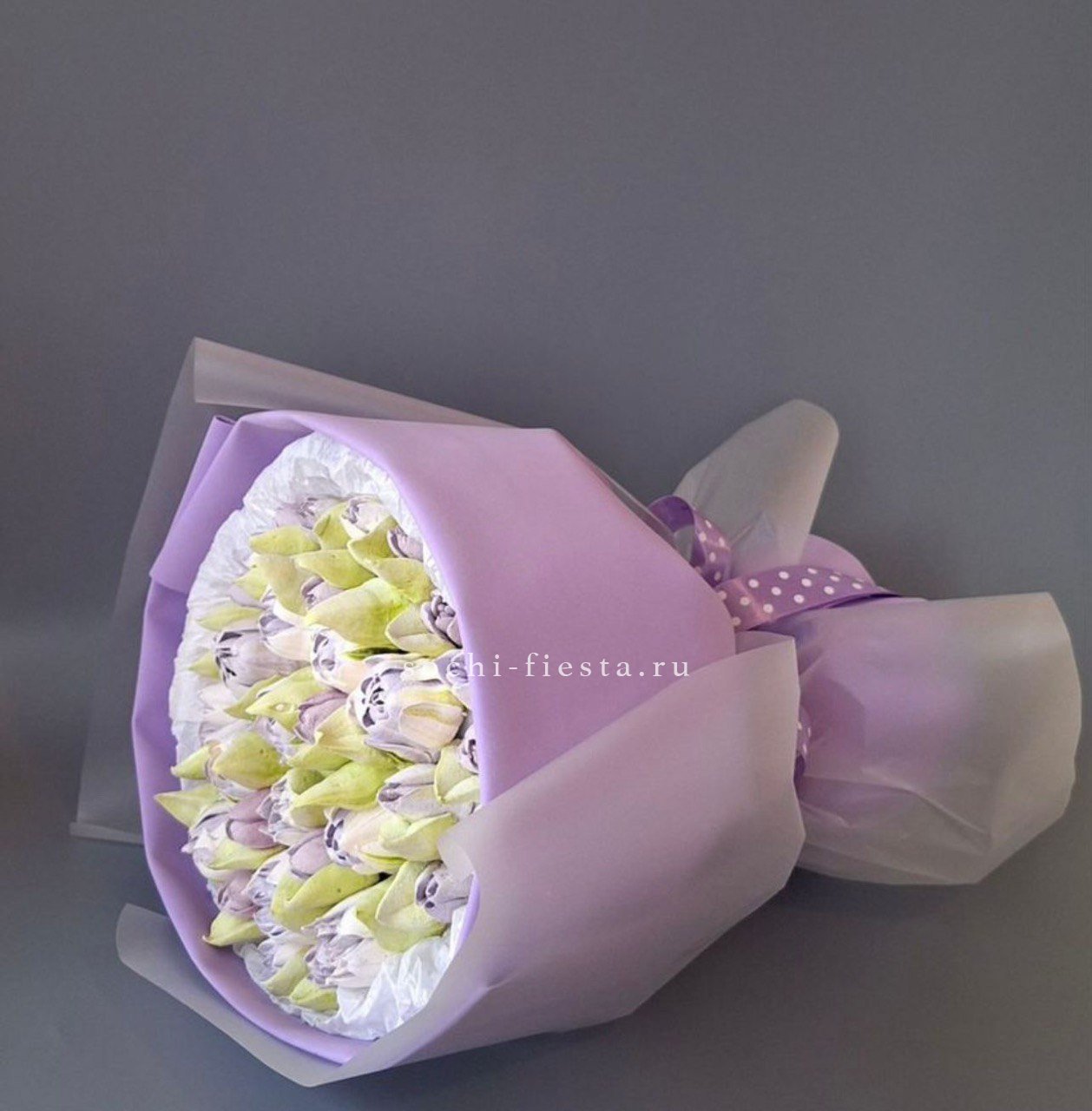 Фиолетовые тюльпаны из воздушного зефира собраны в объёмную композицию. Каждый бутон выполнен отдельно на яблочном пюре и пектине с натуральными красителями.